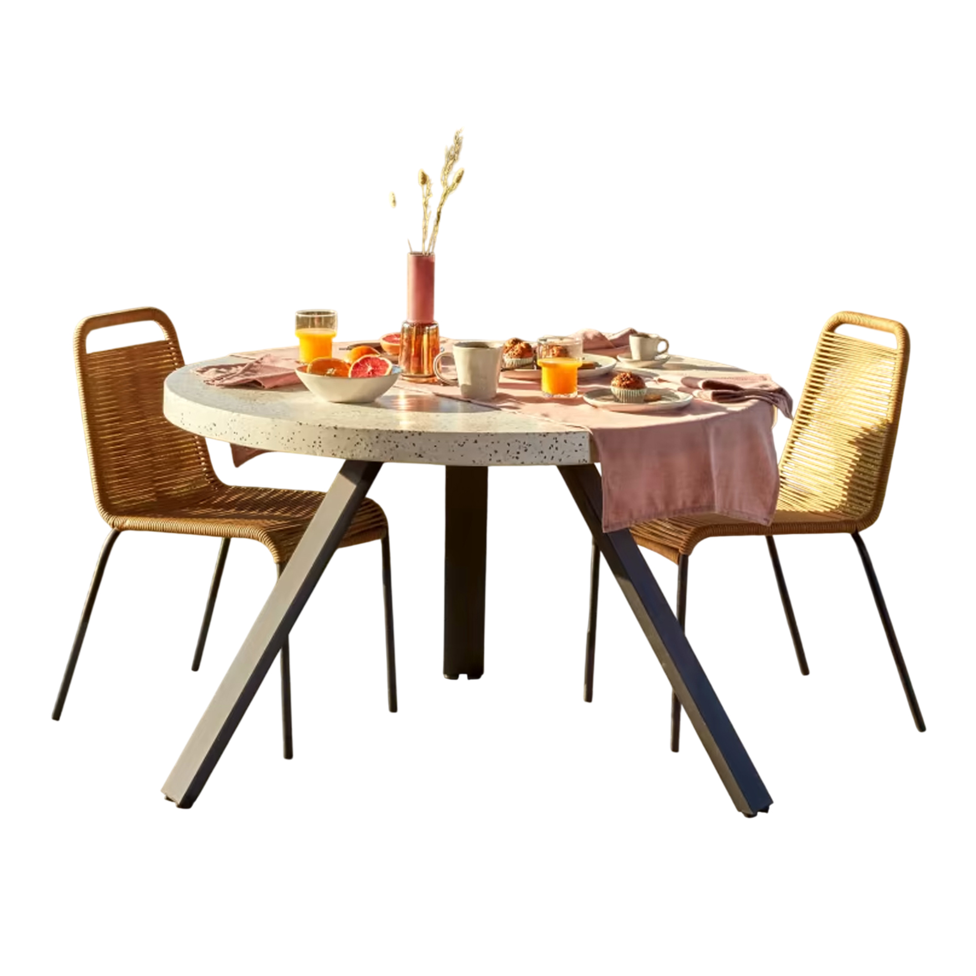 The Alena Dining Sets brings structural elegance and contemporary craftsmanship to your outdoor lifestyle. Perfect dining sets that merges contemporary and classic elements to compliment a modern retreat home. Crafted on a durable metal frame with terrazzo ceramic top table and rope seats for lasting style. The Alena Dining Sets has a clean lined silhouette for a comfortable and casual look. Highlights the beauty of it’s sleek design, it’s a natural choice to celebrate the outdoor with indoor style. Enjoy nature in style while creating cosy an outdoor nooks made for pared back living with The Alena Dining Sets.