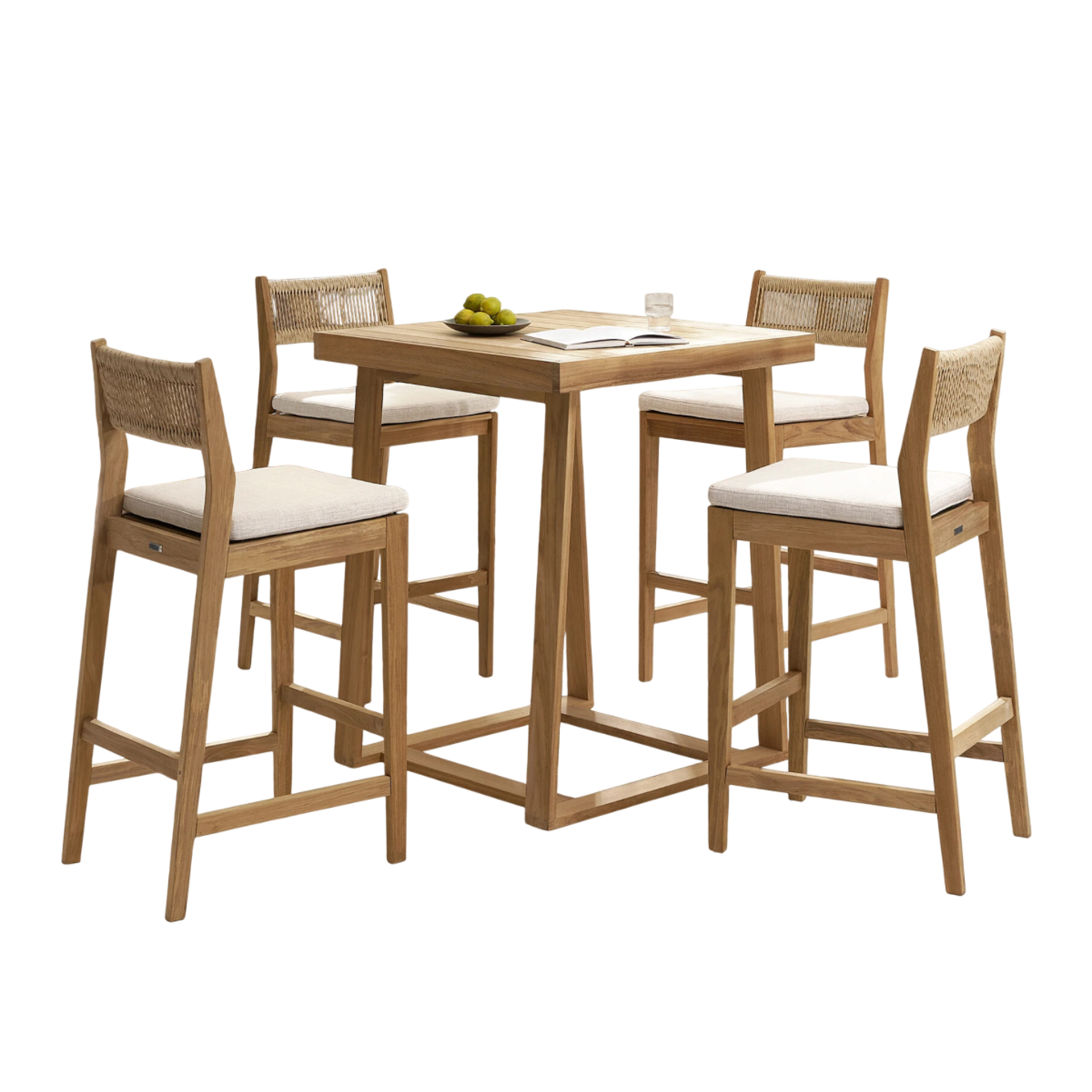 The Jaemin Bar Table Sets brings structural elegance and contemporary craftsmanship to your outdoor lifestyle. The perfect bar table sets that merges contemporary and classic elements to compliment a modern retreat home. Crafted on a durable teak frame with rope detailing seats for lasting style. The Jaemin Bar Table Sets has a clean lined silhouette for a comfortable and casual look. Highlights the beauty of solid teak, it’s a natural choice to celebrate the outdoor with indoor style. Embrace outdoor living in style as you created a cozy and inviting nook inspired by nature. Perfectly suited for calm, pared-back living with The Jaemin Bar Table Sets.