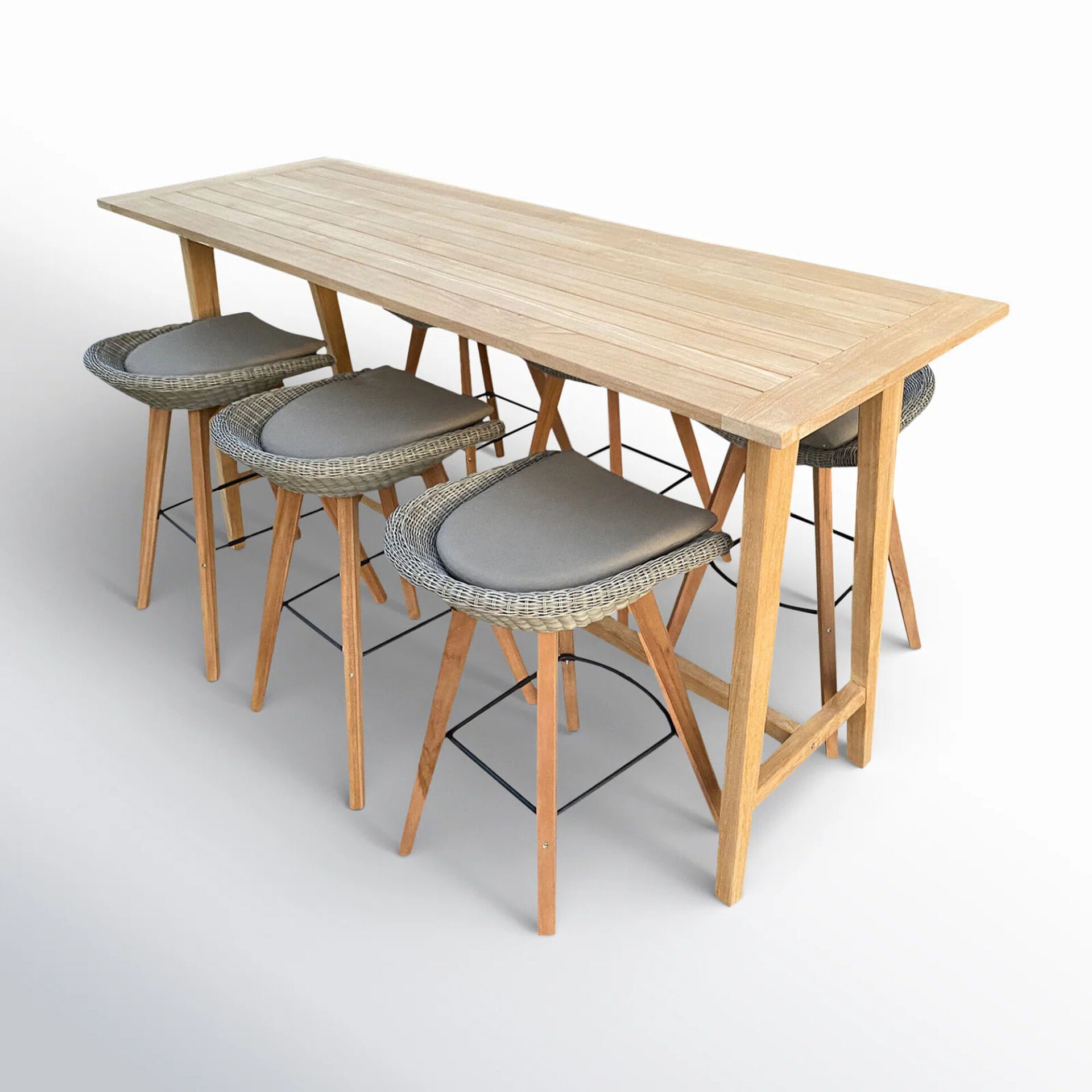 The Kana Bar Table Sets brings structural elegance and contemporary craftsmanship to your outdoor lifestyle. The perfect bar table sets that merges contemporary and classic elements to compliment a modern retreat home. Crafted on a durable teak frame with synthetic rattan seats for lasting style. The Kana Bar Table Sets has a clean lined silhouette for a comfortable and casual look. Highlights the beauty of solid teak, it’s a natural choice to celebrate the outdoor with indoor style. Embrace outdoor living in style as you created a cozy and inviting nook inspired by nature. Perfectly suited for calm, pared-back living with The Kana Bar Table Sets.