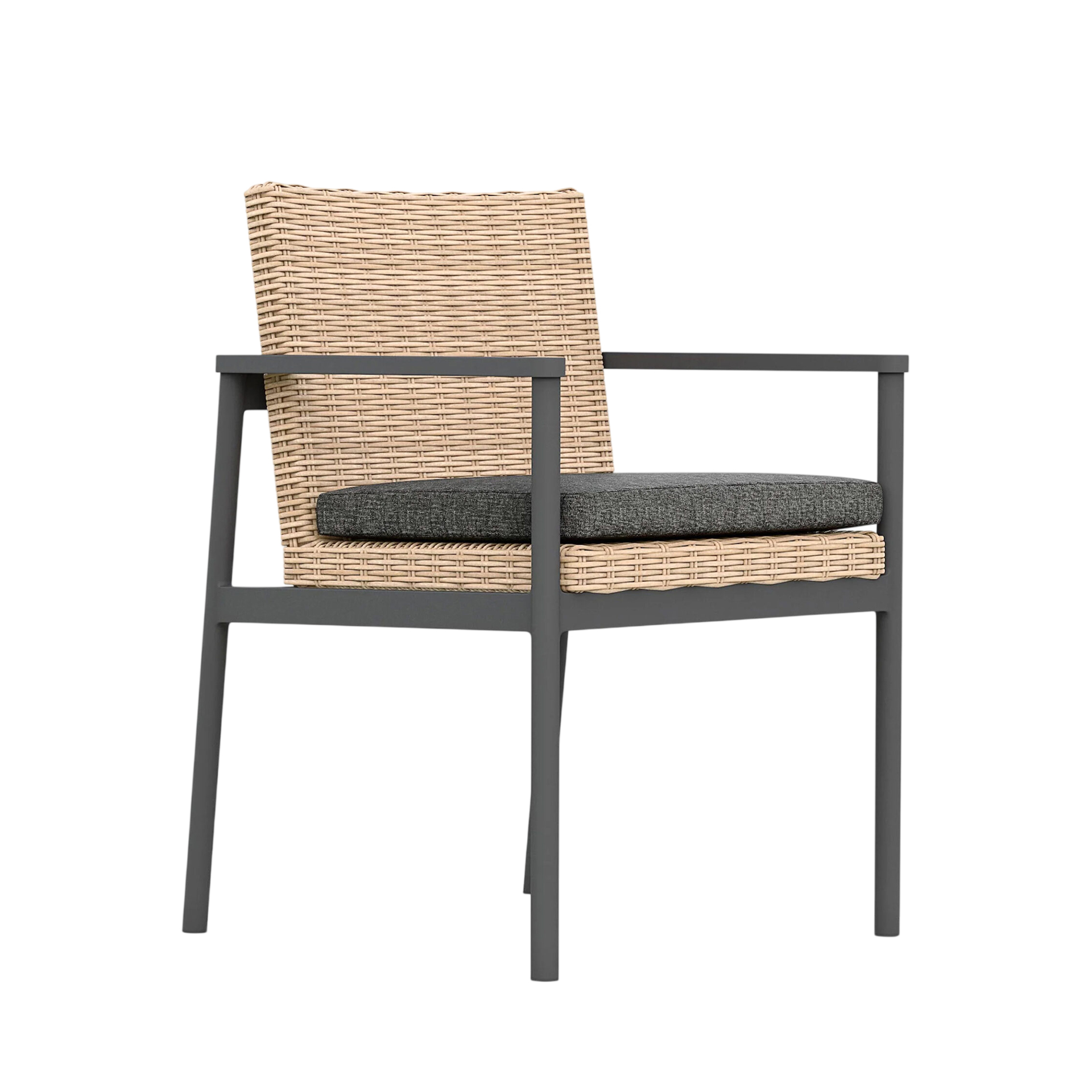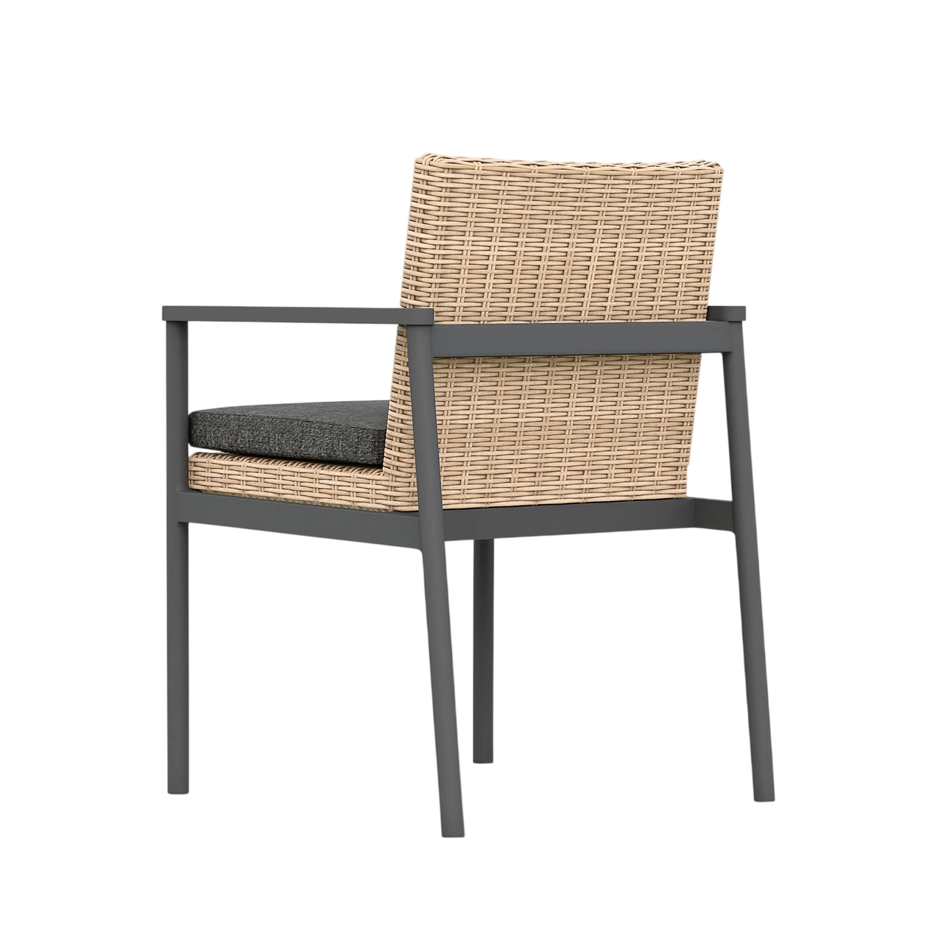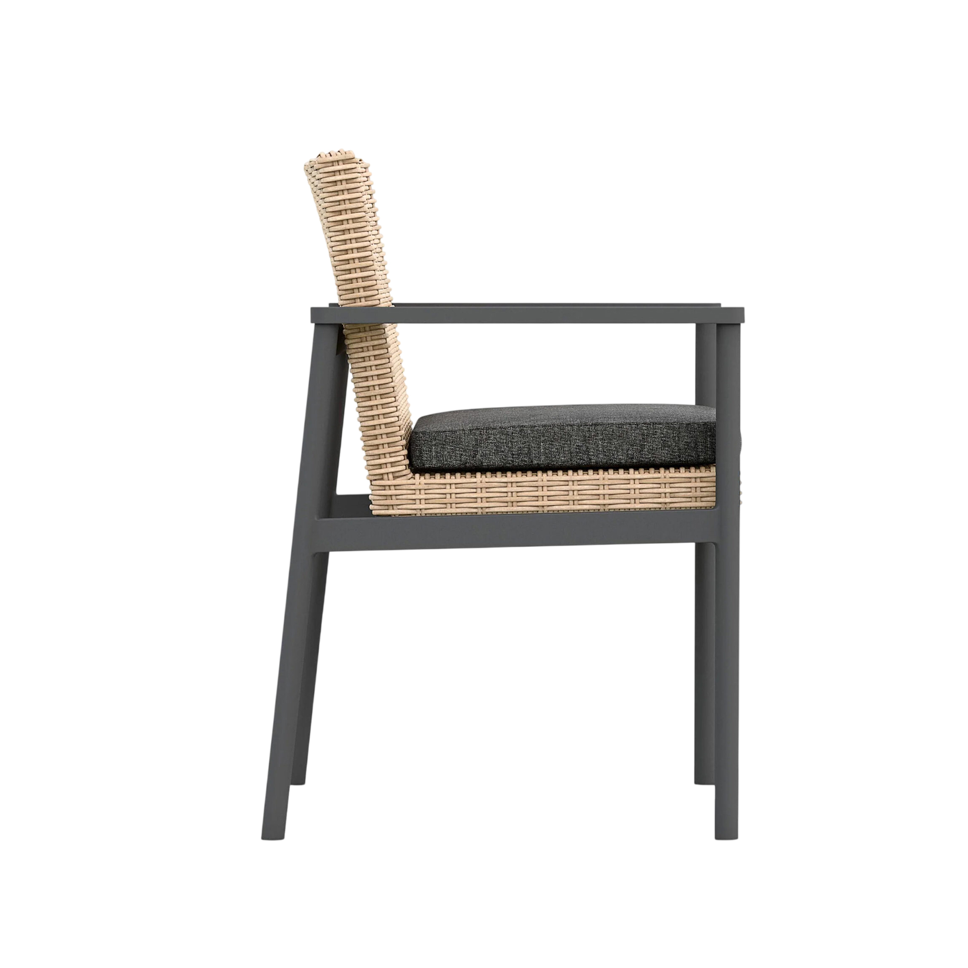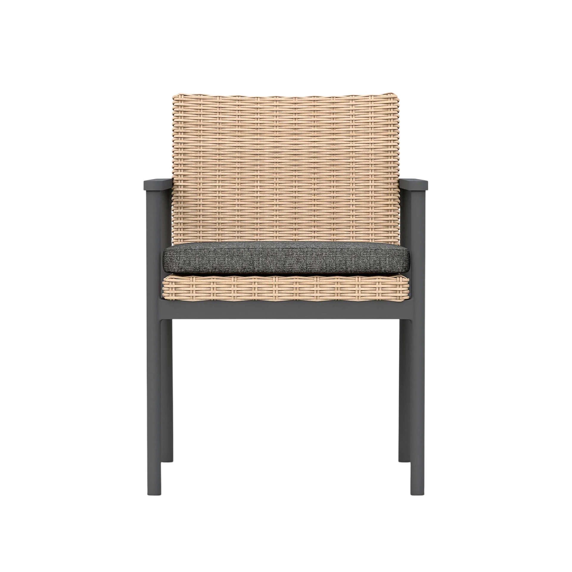 The Karmia Dining Chair brings structural elegance and contemporary craftsmanship to your outdoor lifestyle. Perfect dining chair that merges contemporary and classic elements to compliment a modern retreat home. Crafted on a durable aluminum frame with synthetic rattan detailing for lasting style. The Karmia Dining Chair has a clean lined silhouette for a comfortable and casual look. Highlights the beauty of it’s natural design, suitable for outdoor with indoor style. Embrace outdoor living in style as you created a cozy and inviting nook inspired by nature. Perfectly suited for calm, pared-back living with The Karmia Dining Chair.