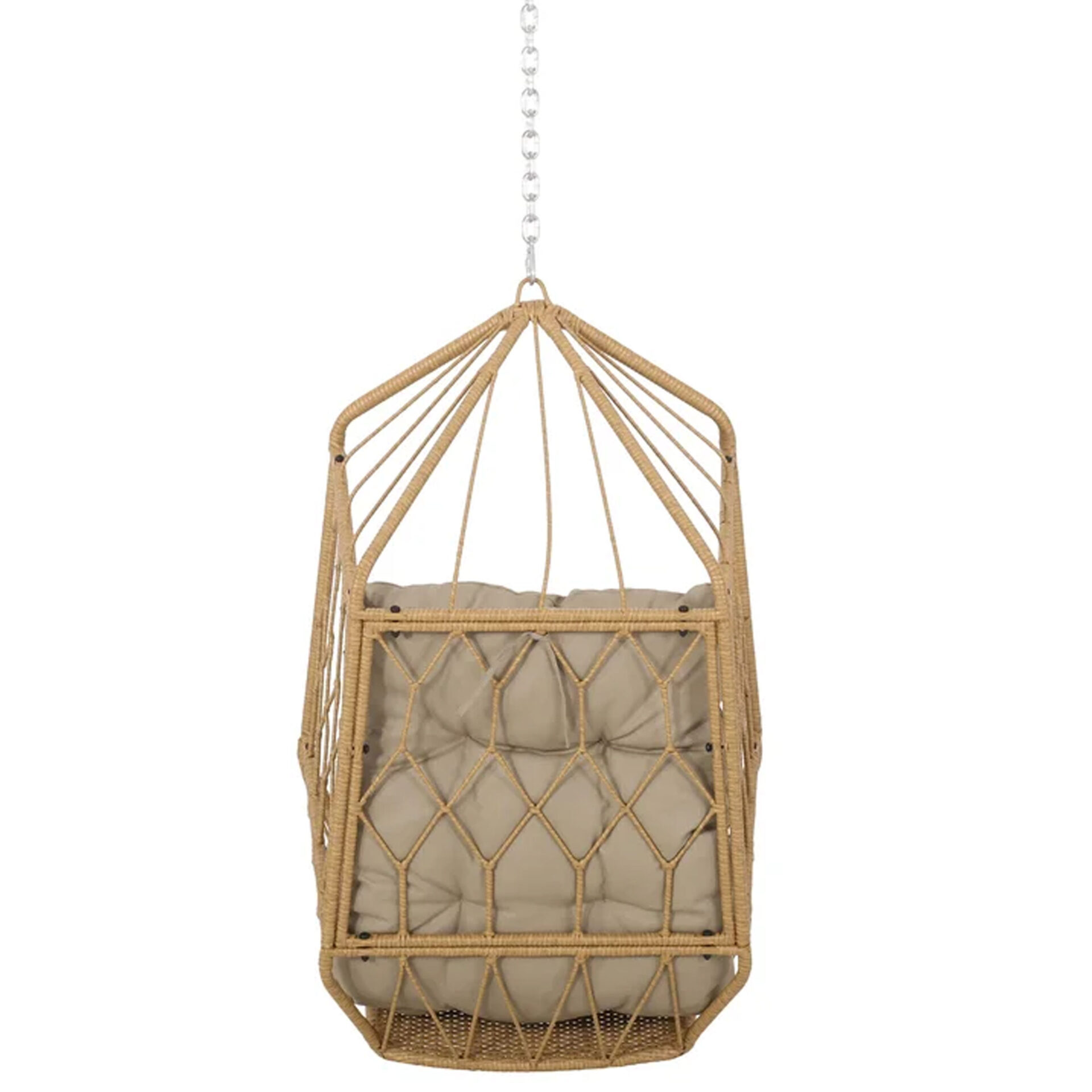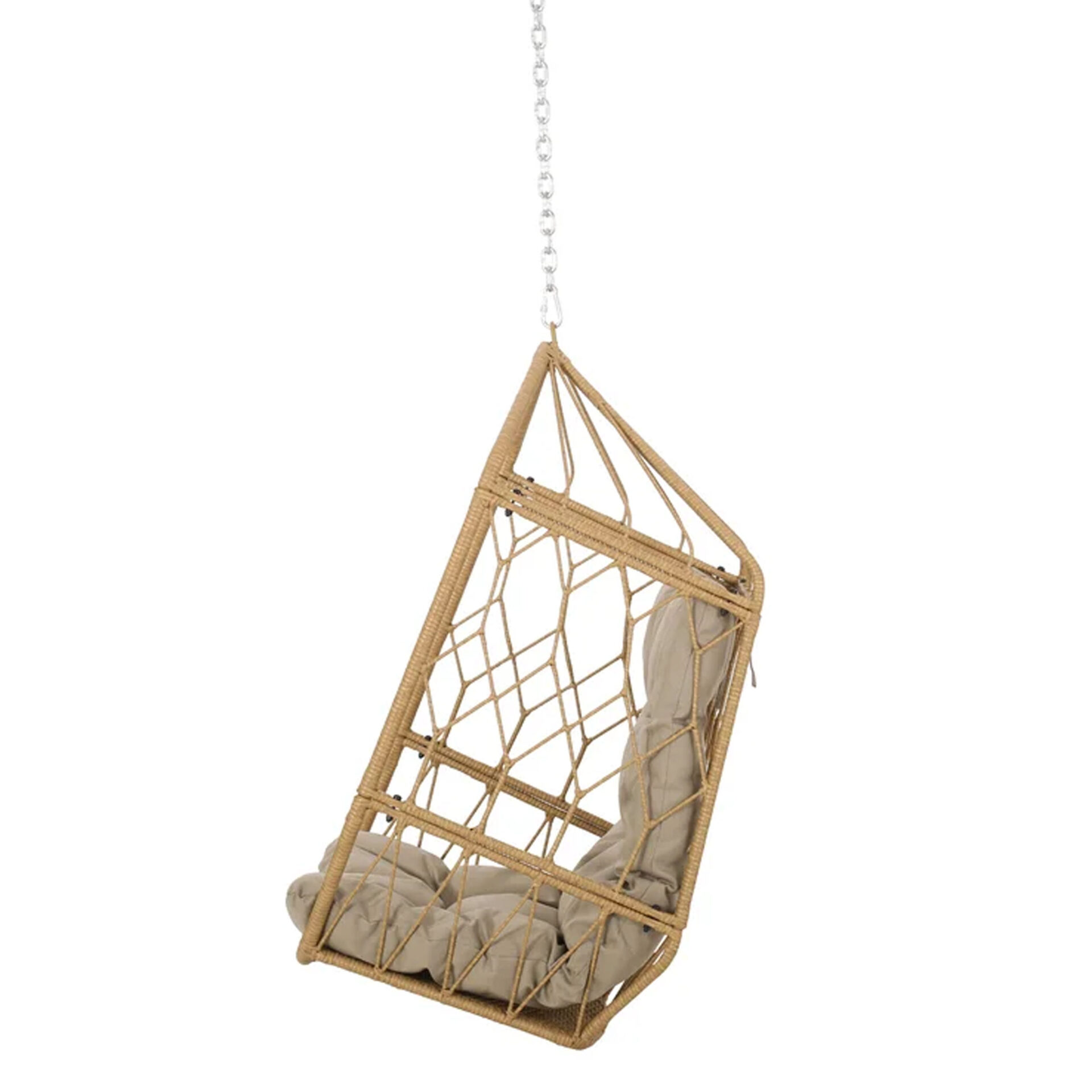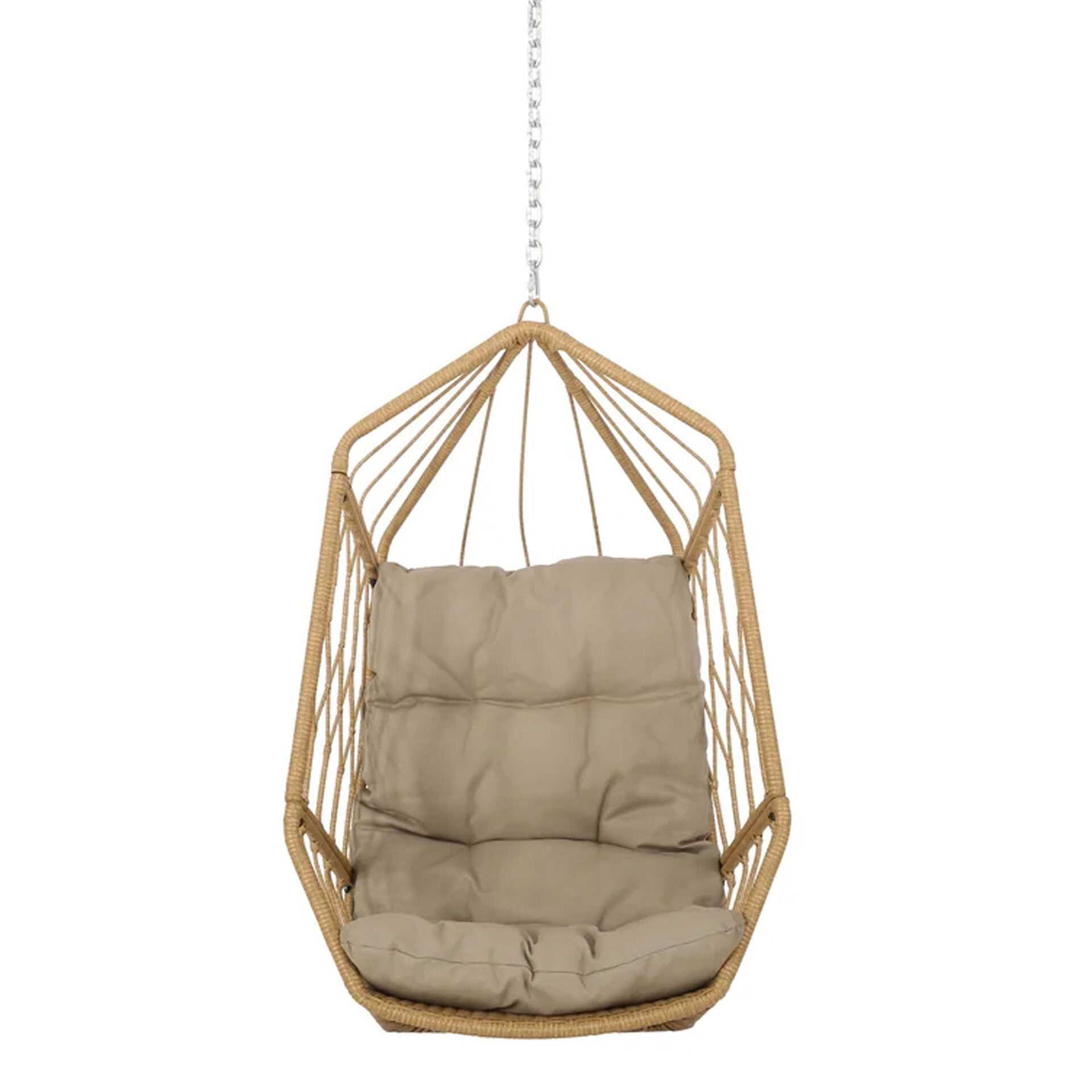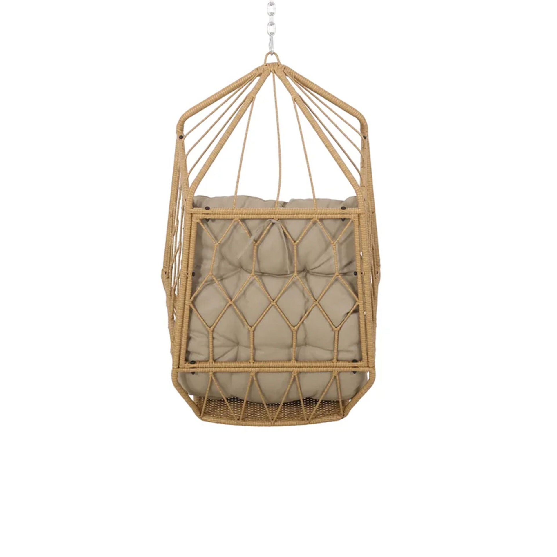 The Kaysa Swing Hanging Chair brings structural elegance and contemporary craftsmanship to your outdoor lifestyle. Perfect swing hanging chair that merges contemporary and classic elements to compliment a modern retreat home. Crafted on a durable metal frame with wicker weave with metal chains for lasting style. The Kaysa Swing Hanging Chair has a clean lined silhouette for a comfortable and casual look. Highlights the beauty ofit’s sleek design, it’s a natural choice to celebrate the outdoor with indoor style. Embrace outdoor living in style as you created a cozy and inviting nook inspired by nature. Perfectly suited for calm, pared-back living with The Kaysa Swing Hanging Chair.