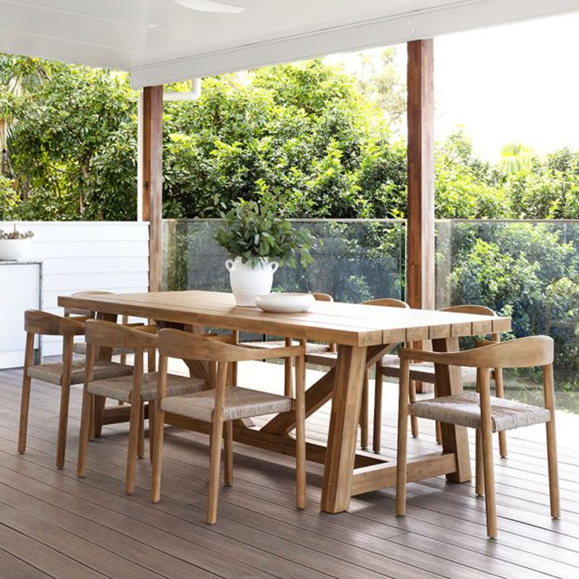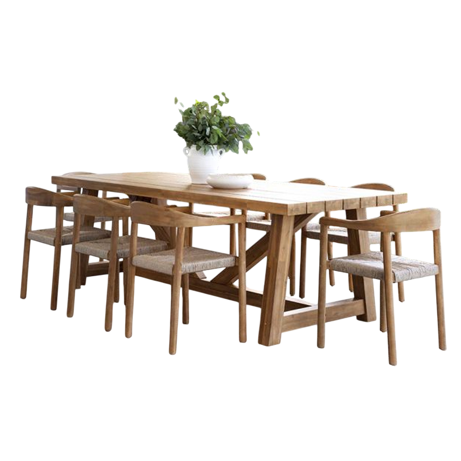 The Manila Dining Sets brings structural elegance and contemporary craftsmanship to your outdoor lifestyle. Perfect dining sets that merges contemporary and classic elements to compliment a modern retreat home. Crafted on a durable teak frame with banana fronds seats for lasting style. The Manila Dining Sets has a clean lined silhouette for a comfortable and casual look. Highlights the beauty of solid teak, it’s a natural choice to celebrate the outdoor with indoor style. Enjoy nature in style while creating cosy an outdoor nooks made for pared back living with The Manila Dining Sets.