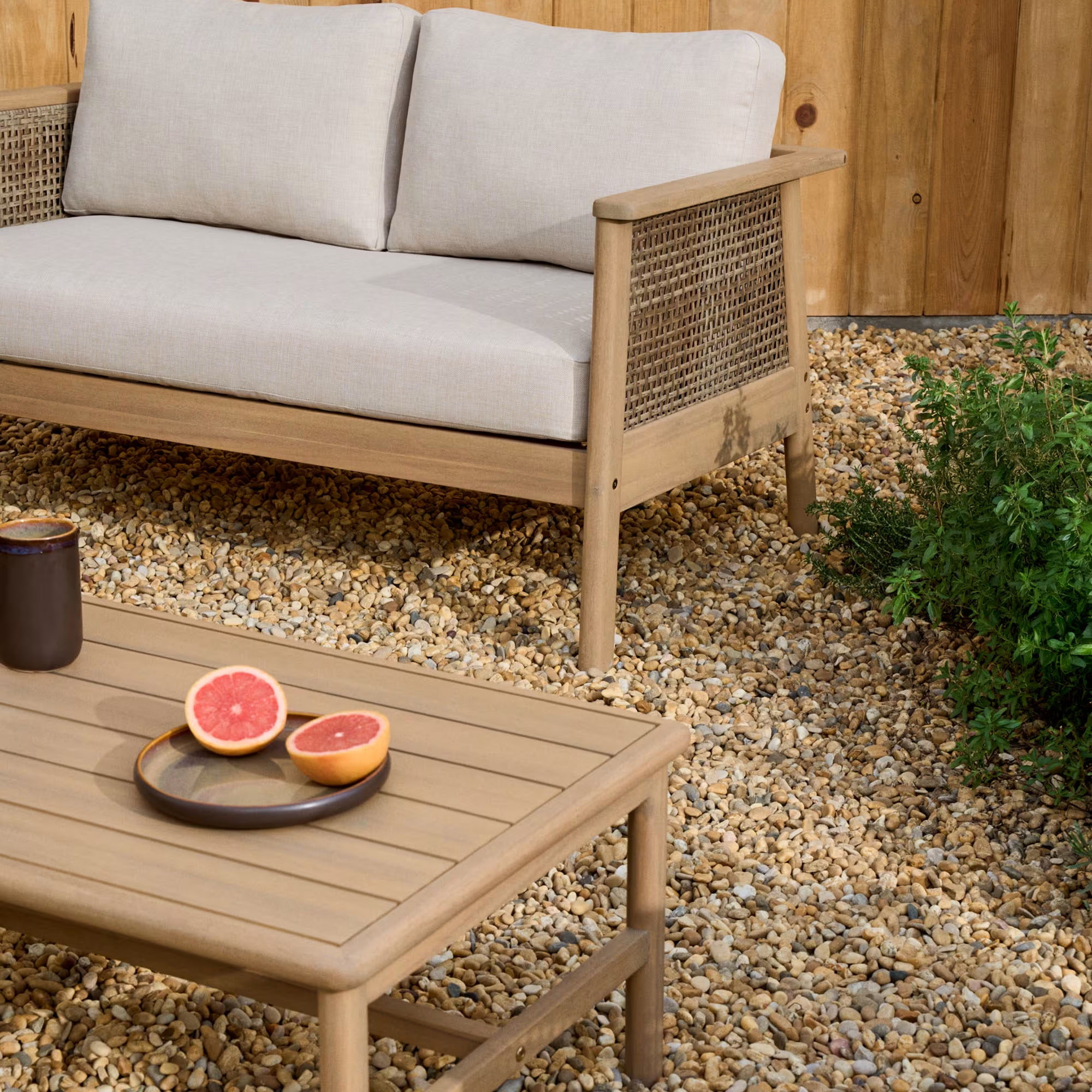This sofa set is a versatile accent piece that showcases your unique personality and invites you to relax. Borrowing from the carefree spirit of coastal aesthetics, this sofa set is clean and uncluttered for a breezy look and feel. Perfect for any outdoor setting, this sofa set features teak wood for lasting beauty. This sofa set’s comfortable and casual style is best for outdoor aesthetic.