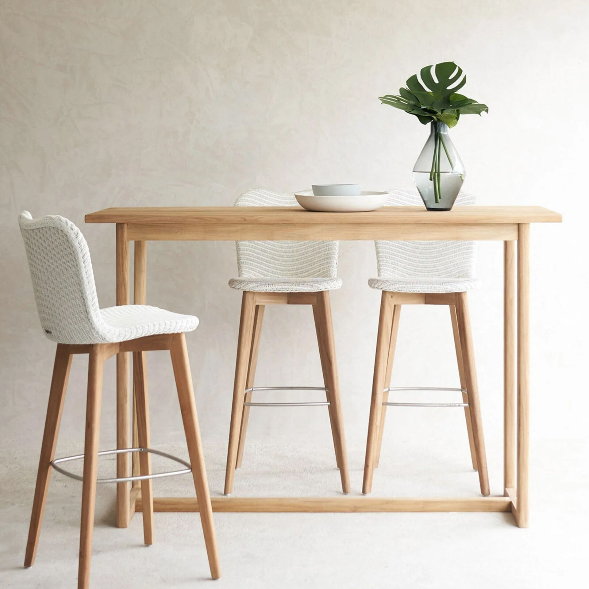 The Mey Bar Table brings structural elegance and contemporary craftsmanship to your outdoor lifestyle. The perfect bar table that merges contemporary and classic elements to compliment a modern retreat home. Crafted on a durable teak frame for lasting style. The Mey Bar Table has a clean lined silhouette for a comfortable and casual look. Highlights the beauty of solid teak, it’s a natural choice to celebrate the outdoor with indoor style. Embrace outdoor living in style as you created a cozy and inviting nook inspired by nature. Perfectly suited for calm, pared-back living with The Mey Bar Table