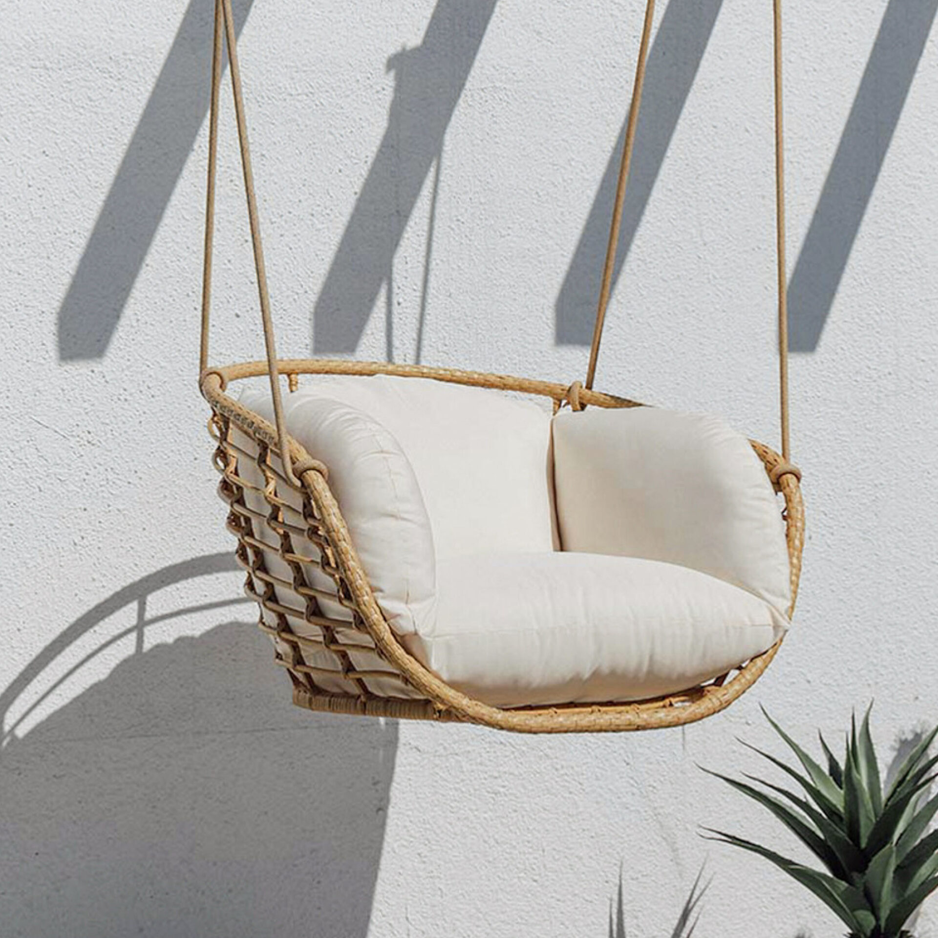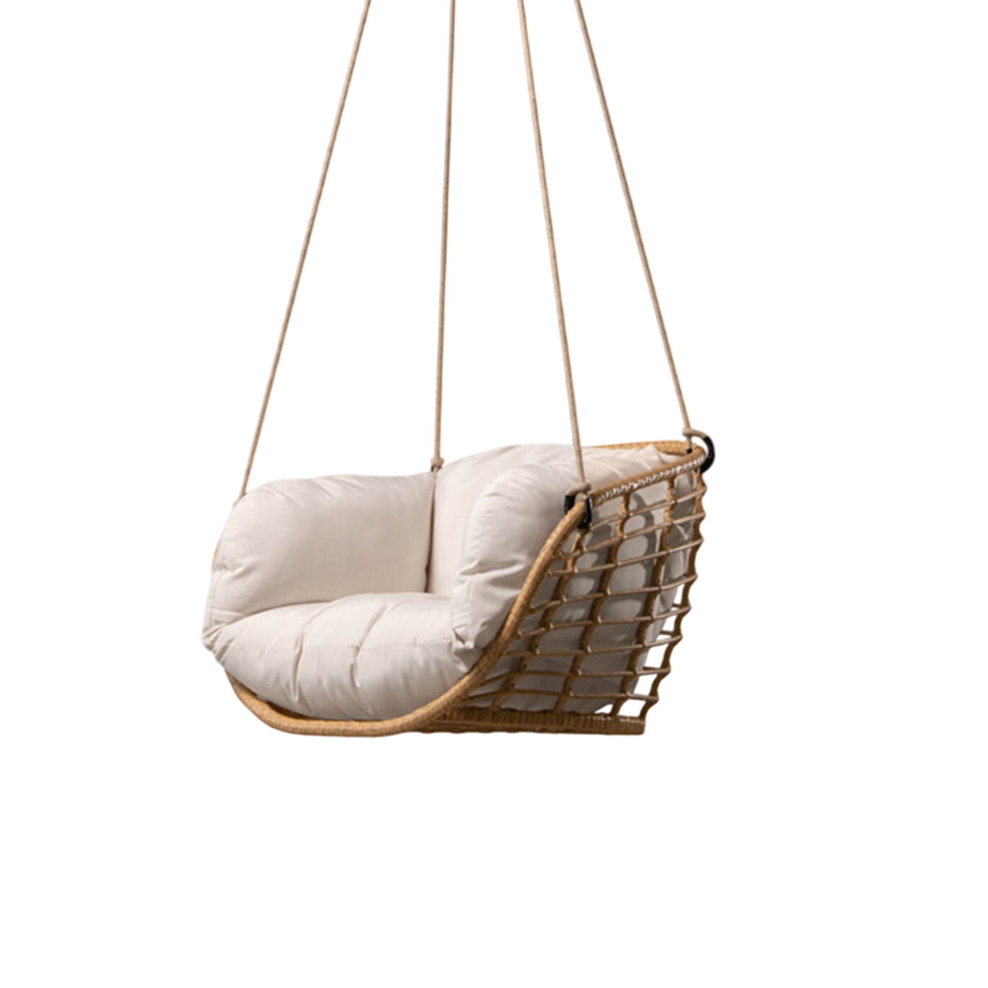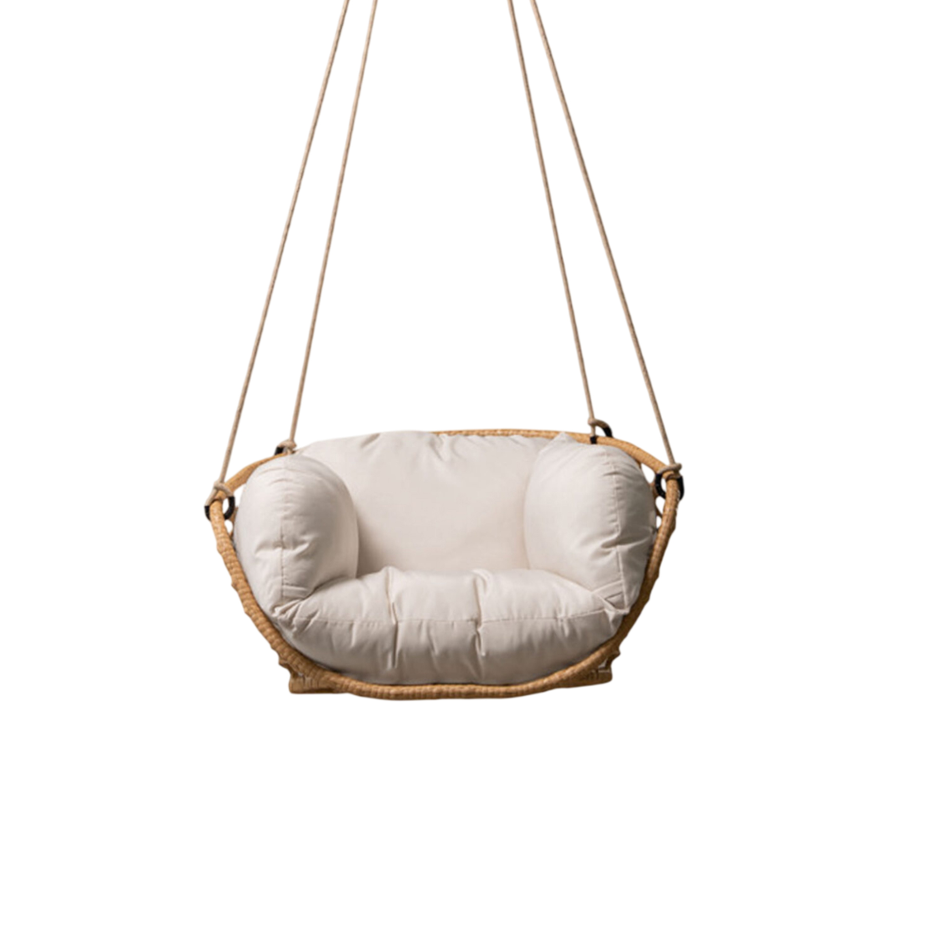The Riri Swing Hanging Chair brings structural elegance and contemporary craftsmanship to your outdoor lifestyle. Perfect swing hanging chair that merges contemporary and classic elements to compliment a modern retreat home. Crafted on a durable metal with synthetic rattan frame with rope chains for lasting style. The Riri Swing Hanging Chair has a clean lined silhouette for a comfortable and casual look. Highlights the beauty of it’s sleek design, it’s a natural choice to celebrate the outdoor with indoor style. Embrace outdoor living in style as you created a cozy and inviting nook inspired by nature. Perfectly suited for calm, pared-back living with The Riri Swing Hanging Chair.