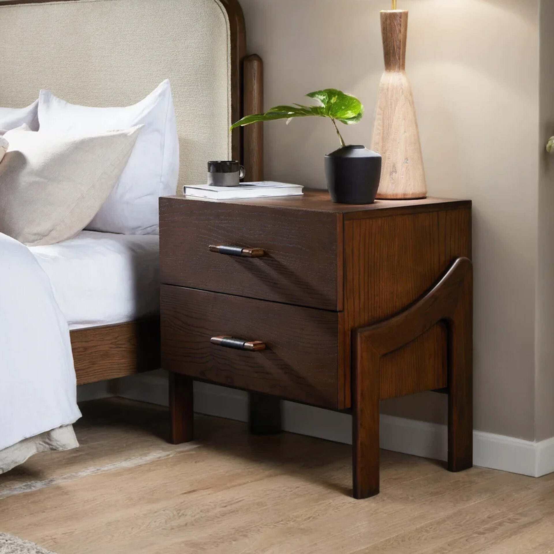 The Saula Nightstand brings structural elegance and contemporary craftsmanship to your indoor lifestyle. The perfect nightstand that merges contemporary and classic elements to compliment a modern retreat home. Crafted on a durable teak frame for lasting style. The Saula Nightstand has a clean lined silhouette for a comfortable and casual look. Highlights the beauty of solid teak, it’s a natural choice to celebrate the indoor with outdoor style. Embrace indoor living in style as you created a cozy and inviting nook inspired by nature. Perfectly suited for calm, pared-back living with The Saula Nightstand.